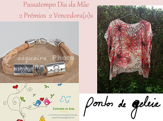 Os prémios que vamos oferecer são: uma pulseira em cortiça( os filhotes podem ser alterados) do Espaçinho do Guga e um top do Pontos de Geleia.